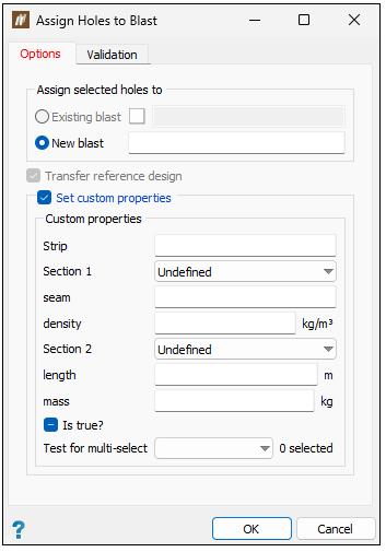 On the Home ribbon, in the Blast group, select Assign Holes to Blast. The Assign Holes to Blast panel will appear.