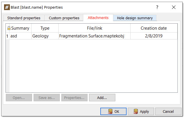 The Attachments tab displays the attachments currently linked to the blast. For more information on the options on this panel, see the Attachment page.