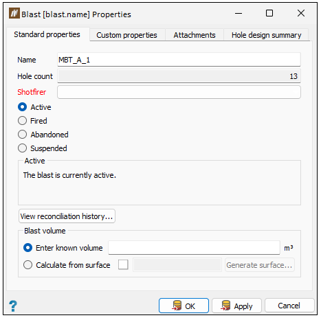 The Blast volume section allows you to enter the blast volume for the selected blast. If the blast volume is not known, you can approximate it by selecting the Calculate from surface radio button. You can enter an existing surface by dragging the surface from the cad container in the data explorer into the field using the middle mouse button or by specifying the surface location using the format /cad/<surface name>.
