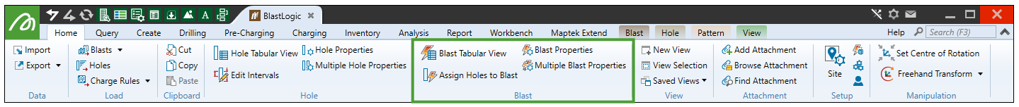 The Blast group of the Home ribbon contains tools that allow you to view blast data and edit blast properties.