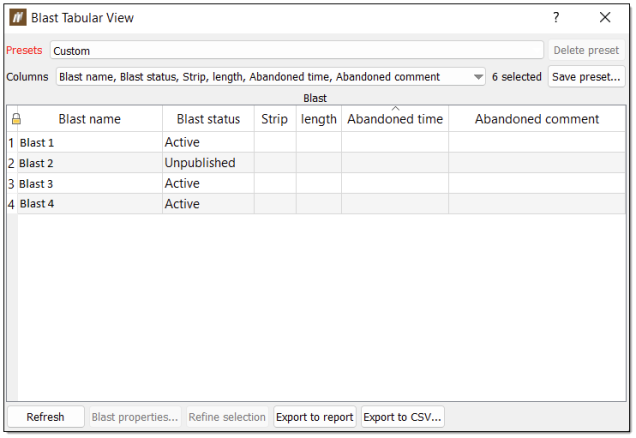 The Blast Tabular View tool allows you to view the data of selected blasts. You can then export this data as a PDF or CSV file.