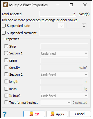 - Edit the properties of the blasts. Select the checkbox of a property to enable editing. You can then modify the value of this property for all the selected blasts.
