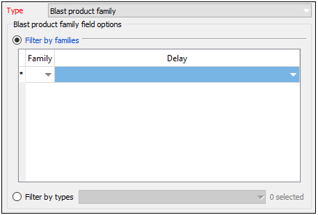 Set the product family by filtering using the Filter by families or Filter by types radio buttons and drop-downs. To filter by families, enter the desired family and delay using the Family and Delay columns and drop-downs. -