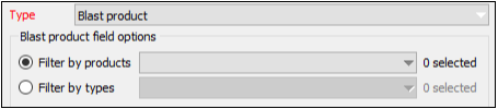 The products available in the drop-down list are Air, Drill Cuttings, and any Blast Product charge rule parameter defined on the Parameters tab.