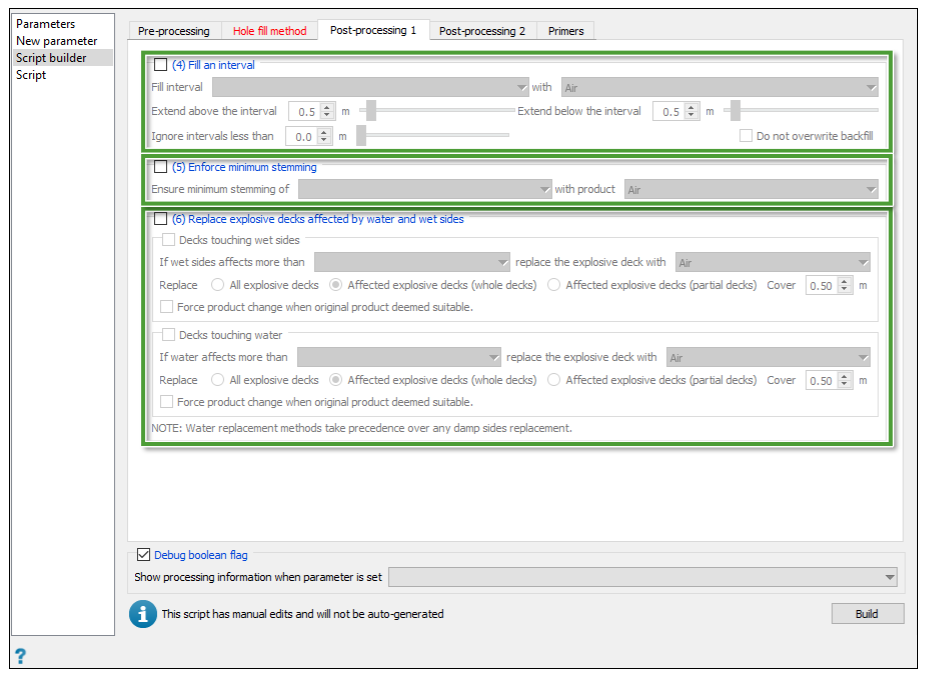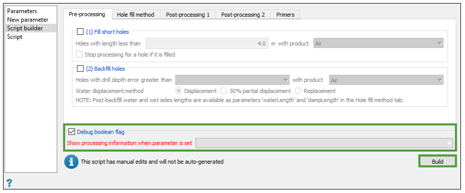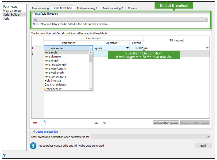The Script builder tab provides a user-friendly interface to define the conditions under which to fill holes. It was created for customers who do not want to use the Scripting tab to create charge rules. The script is generated based on the options selected by clicking the Build button at the bottom of the window on the left-hand side.