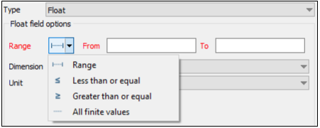 Range, dimension, and unit can be defined when Float type is selected. To set the range of the parameter, select one of four range definitions (Range, Less than or equal, Greater than or equal, or All finite values), and enter the desired values. To set the Dimension and Unit, use the corresponding drop-downs. -