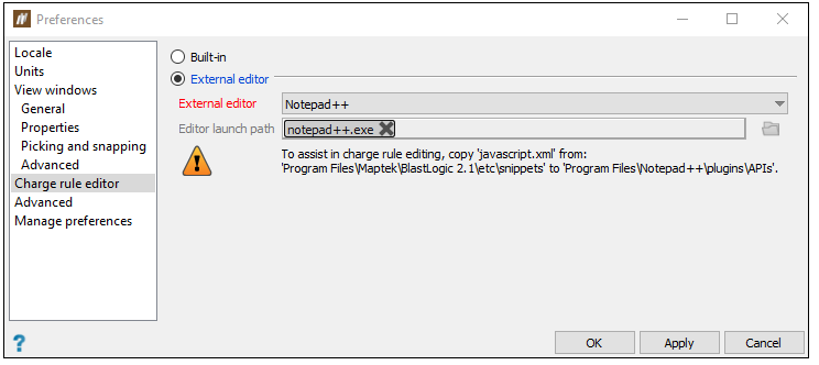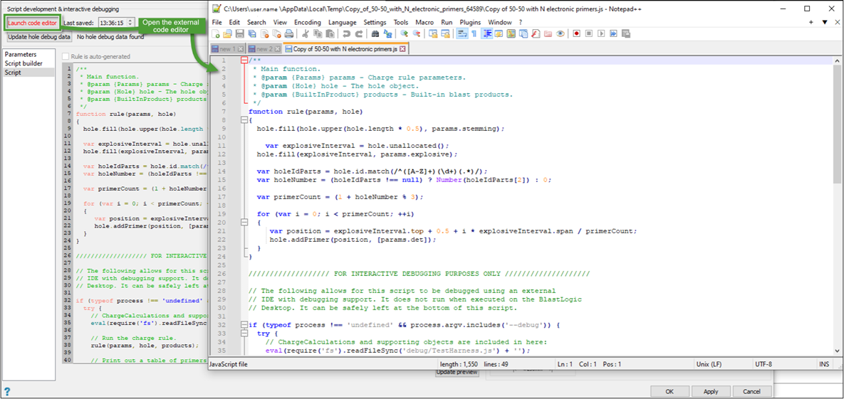 In Notepad++ (64-bit version), auto-complete will only provide help for hole-related functions and properties. In order to enable this functionality, the javascript.xml provided in Program Files/Maptek/BlastLogic 2020/etc/snippets