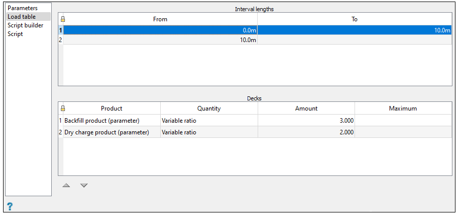 There are two tables in the load tables tab: the Interval lengths table and the Decks table. Each row in the Interval lengths table defines a range of hole lengths via the From and To columns. Each row also has an associated list of decks that are applied to the hole if the length of the hole falls within range. You can define these decks in the Decks table.
