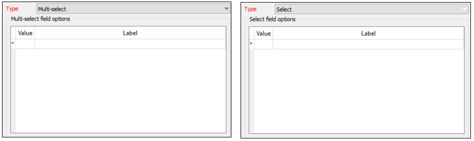 Select. These fields display a table in which you can enter each possible value for the field. These values will be shown in a drop-down list for the field and you can only select one value at a time.