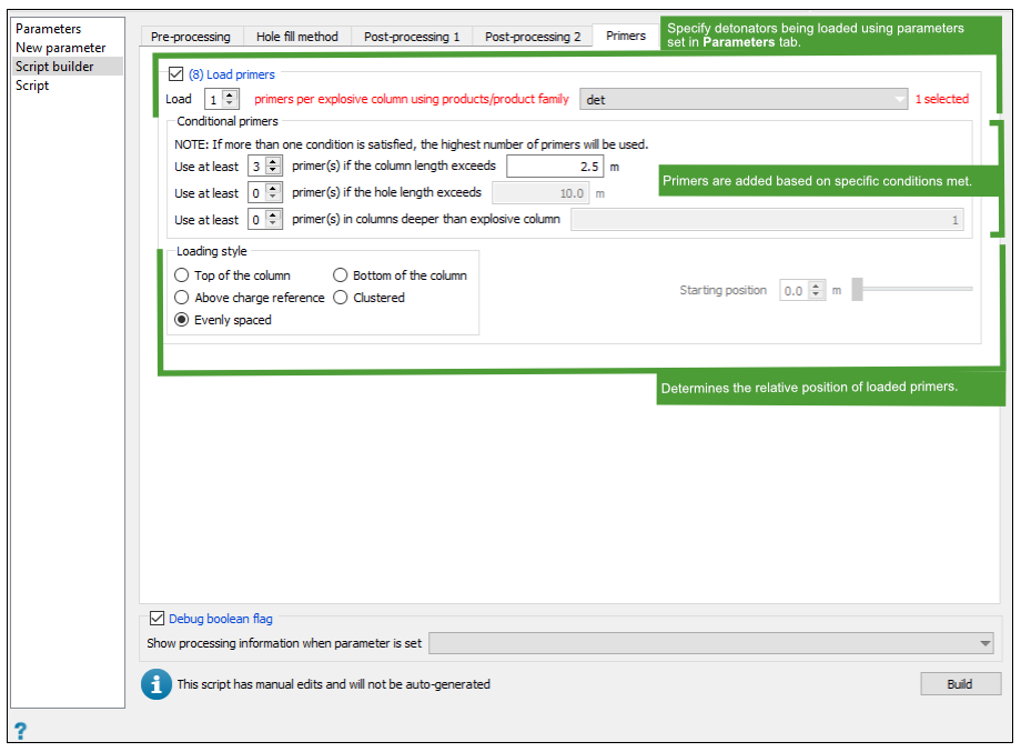 Load [n] primers per explosive column using products/ product family. Adds the required number of primers to a column containing the products/ product families selected from the drop-down menu (possibility to select multiple items from explosive, stemming, and det) .