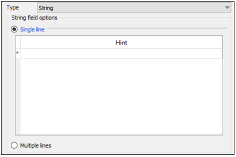 You can set commonly entered values in the Hint column. Optionally, select the Multiple lines radio button for a multiple line string. You cannot define hints for this option.