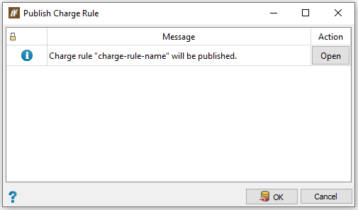 The Publish Charge Rule panel will appear. This panel contains any errors that you can fix by selecting the Open option to fix the error in the Action column. If no errors are present, BlastLogic will present a publishing message in the table.
