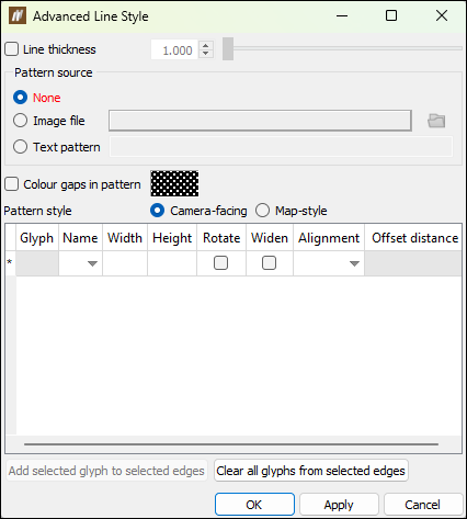 Glyphs. Glyphs are basic shapes that can be incorporated into the line pattern. The glyph table provides a wide range of settings such as Width, Height, Rotate, Widen, Alignment and Offset distance. These allow tight control on placement of the glyphs as well as behaviour in the image, such as whether the glyphs are attached to the line or can rotate freely around the line.