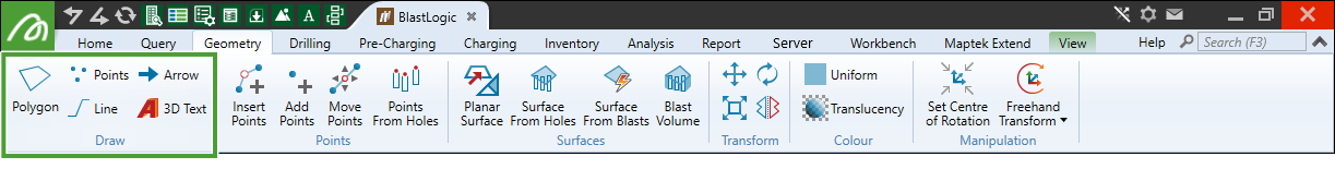 The Draw group of the Geometry ribbon contains tools that allow you to create shapes and text.