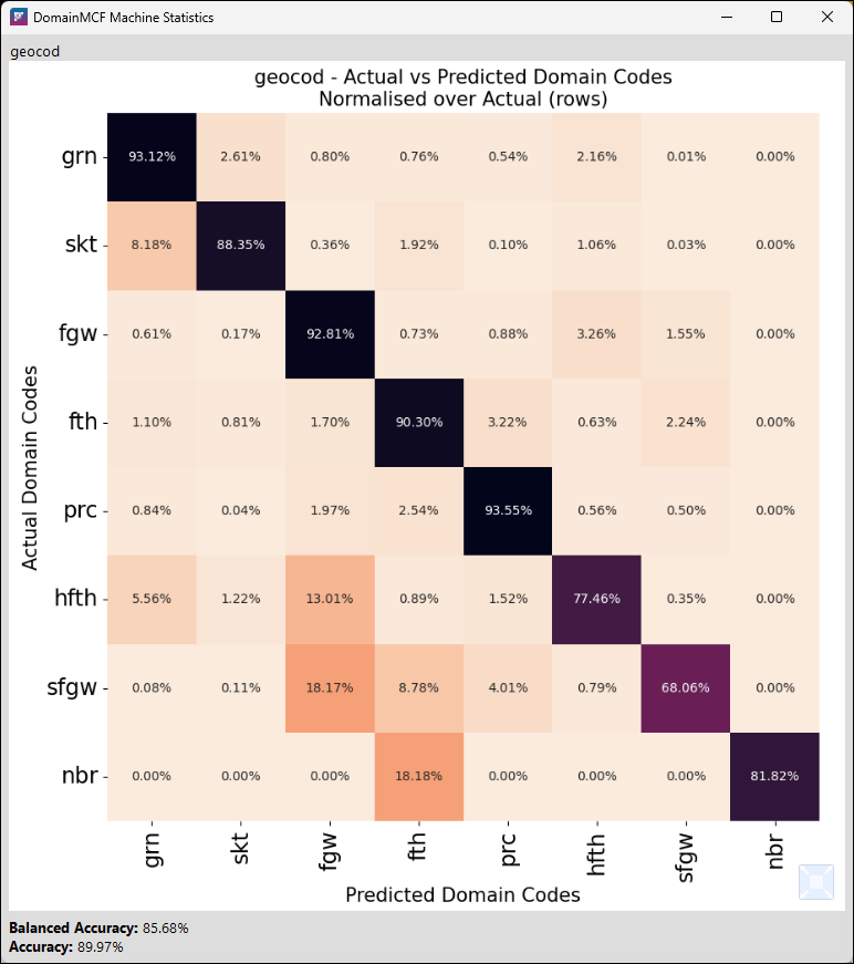 Balanced accuracy is defined as the sum of each individual accuracy score for each domain code, divided by the total number of domain codes. This means that each individual accuracy for each domain code contributes equally to the overall balanced accuracy, irrespective of how represented it is in the data. This is useful for seeing how well the model honours the data used to train it, compensating for bias due to imbalances in the distributions of the provided sample data. |