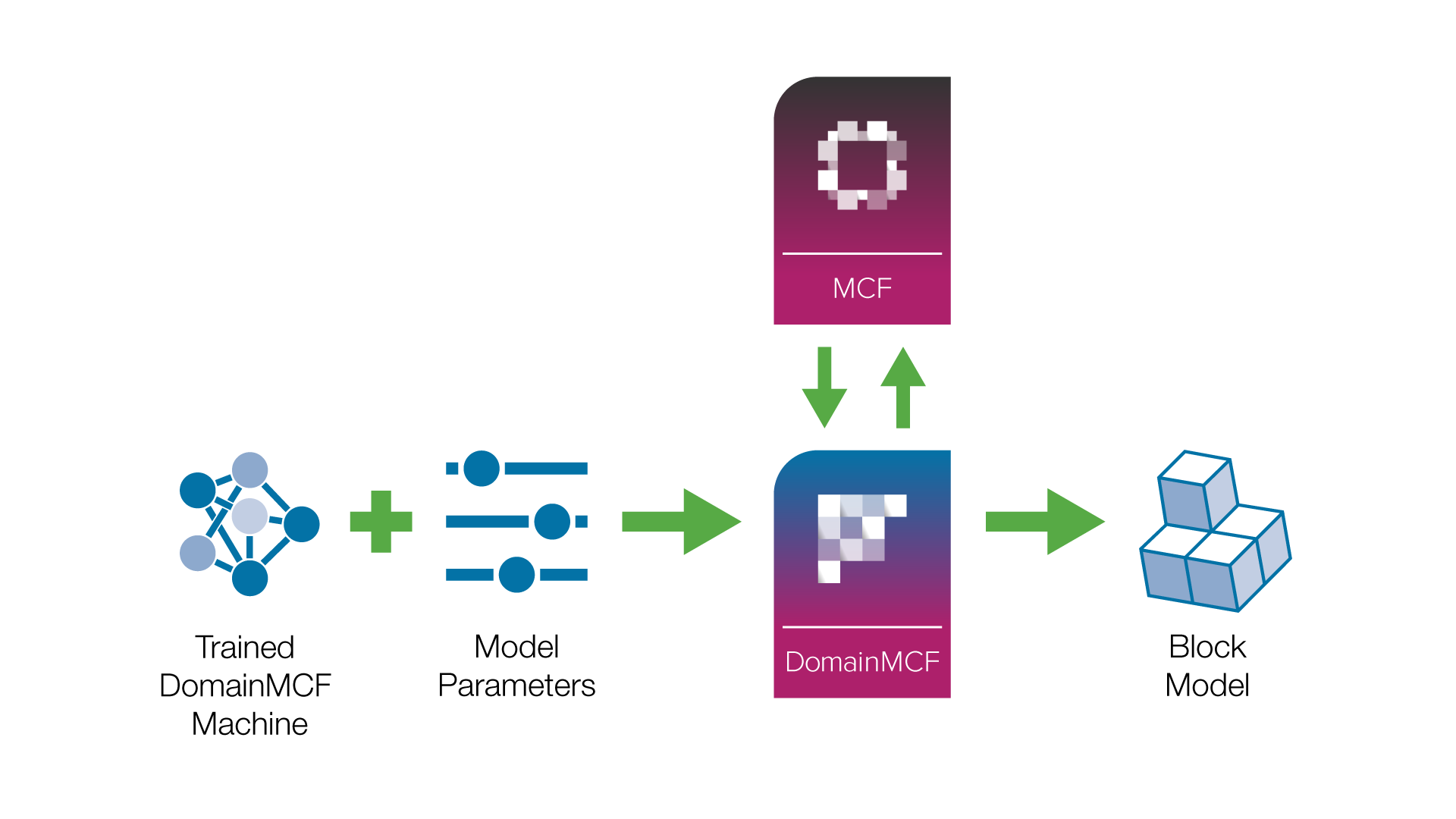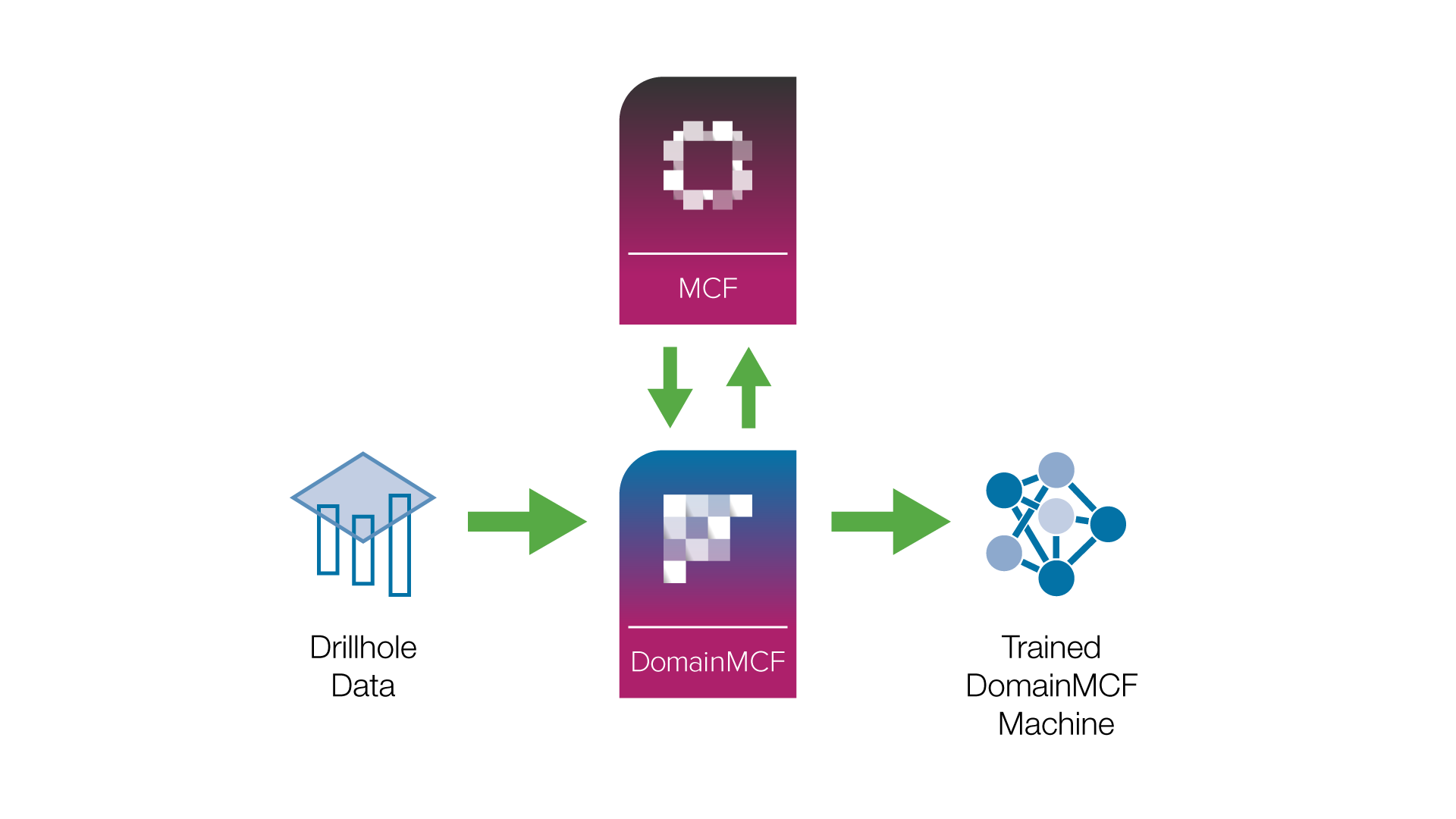 The DomainMCF process is straightforward. Initially, you’ll need to supply your drillhole sample data as a set of points with associated domain codes. DomainMCF uploads the data to the Maptek Compute Framework (MCF) The Maptek Compute Framework (MCF) is a cloud-based service that performs the computationally intensive parts of the DomainMCF process. This includes the tasks of training a machine learning model on a potentially large input dataset, and predicting domain boundaries based on this input., which trains a model that can either be used immediately to generate a block model representing predicted domain boundaries, or downloaded for future use.