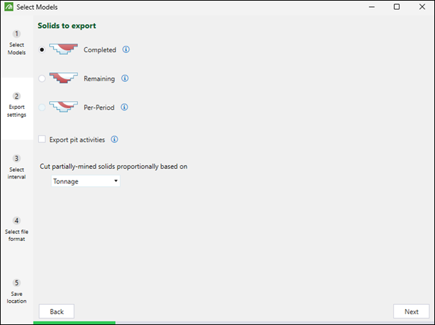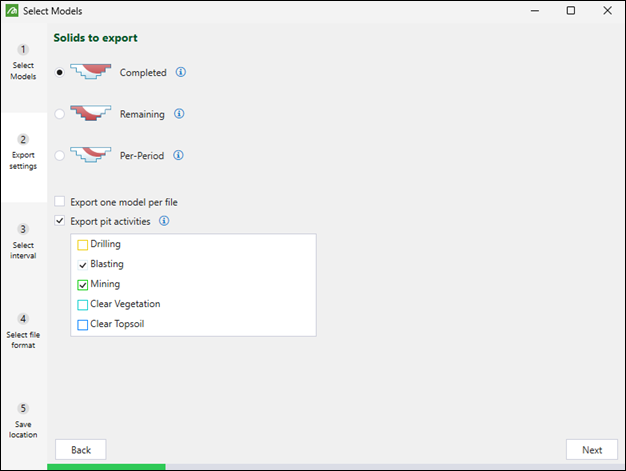 Export pit activities: A separate file will be exported for each activity you select. Pit solids will be considered complete if the selected activity has been completed in them. This checkbox will appear only if you have selected a pit model in the previous step.