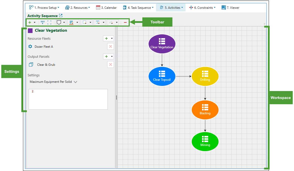 Activity Sequence subtab to add and define activities at a solid or parcel level. The subtab consists of the toolbar, settings area, and workspace.
