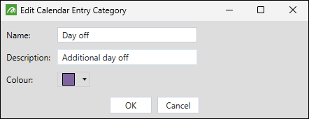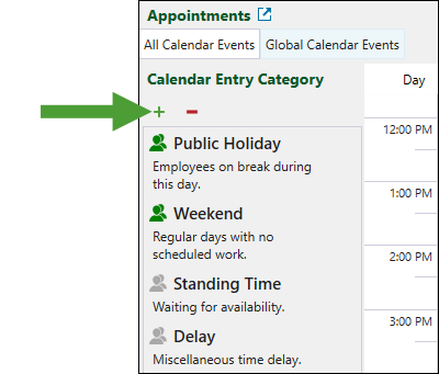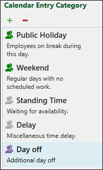 Note: For Public Holiday and Weekend entries, you can set an event lasting up to 24 hours (a full day). Standing Time, Delay, and any custom entries you add have a fixed duration of 30 minutes.