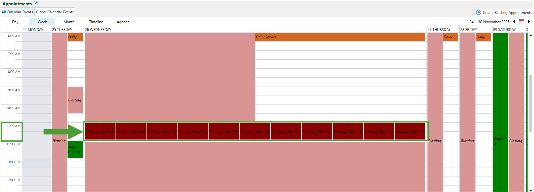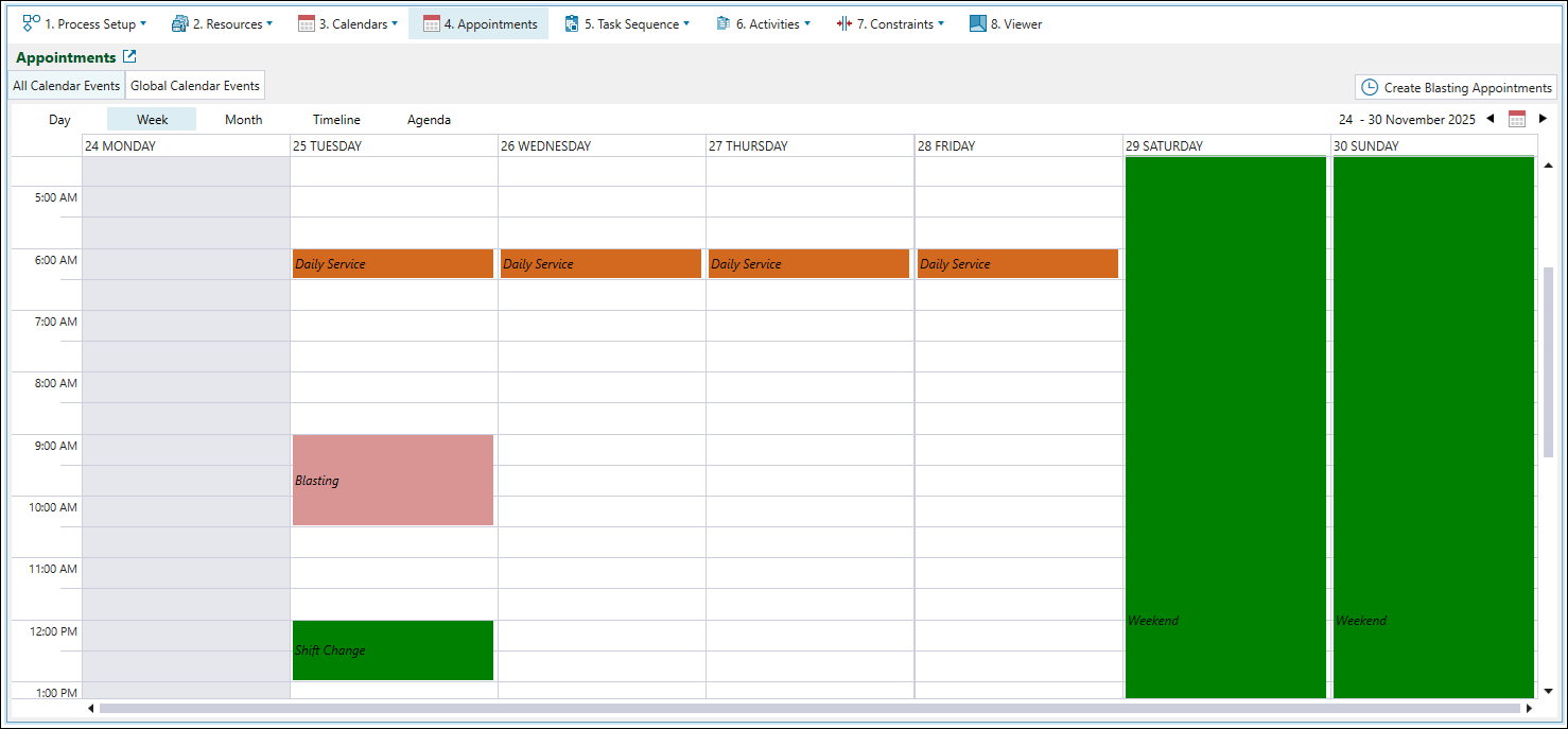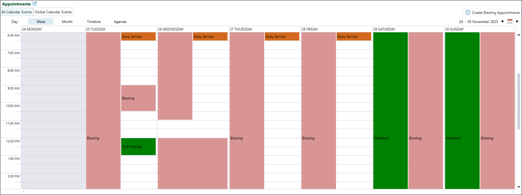 Appointments tab provides you with a complete overview of site appointments during which equipment operation is suspended. These include general delays, maintenance, and global events such as public holidays and weekends. In this tab, you can view both the All Calendar Events tab and the Global Calendar Events tab, as well as add blasting appointments to your schedule.