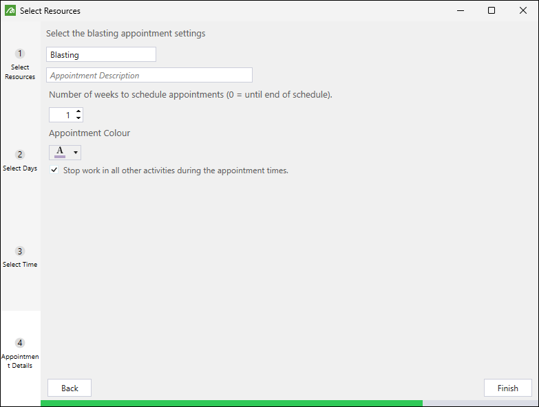Select the checkbox at the bottom of the appointment configuration fields if you want all other activities to stop while the blasting appointment is in progress.