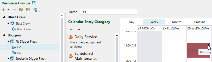 Note: For other resource groups that are unrelated to the scheduled blasting, the blasting appointment will be shown during the actual planned time slot if you have selected the Stop work in all other activities during the appointment times. checkbox in the blasting appointment configuration panel. This prevents other resource groups from working during blasting activities.