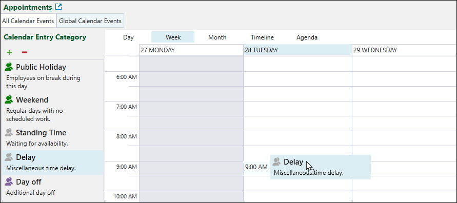 To add an entry to the Global Calendar, drag the required entry category from the Calendar Entry Category section into the required time slot.