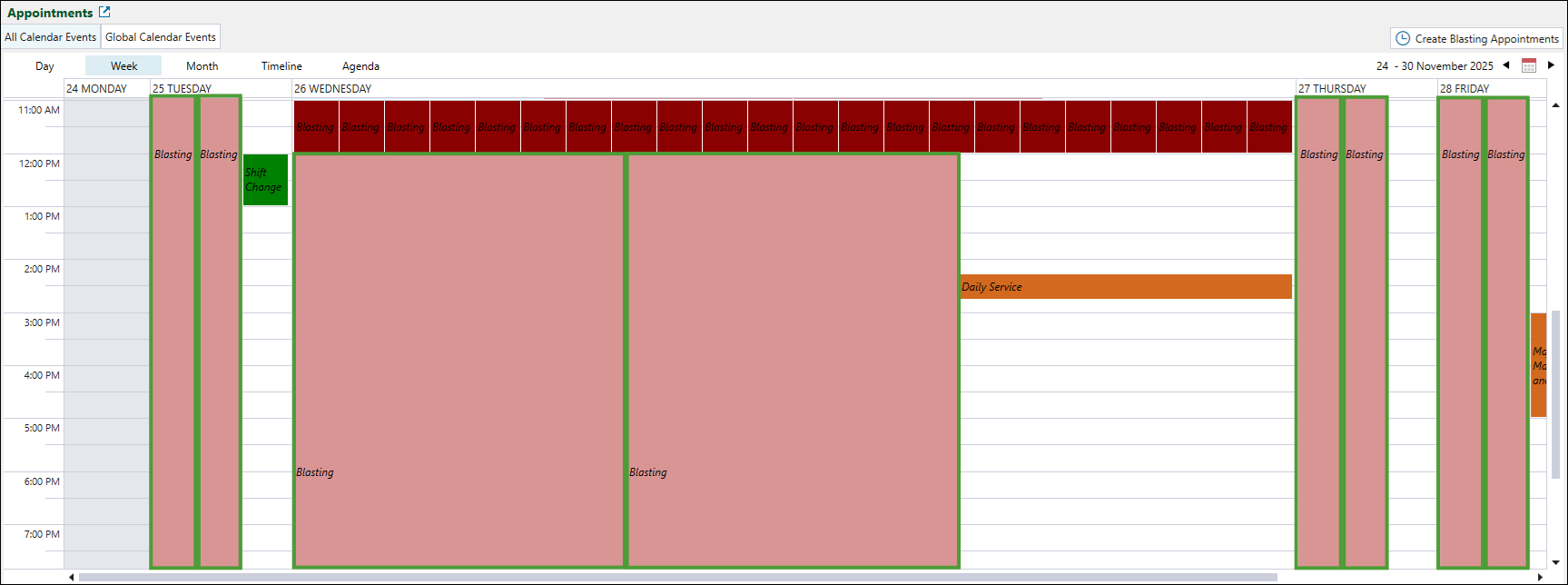 Appointments calendar as Blasting, but with a lighter colour to indicate that the site must be clear for scheduled blasting.