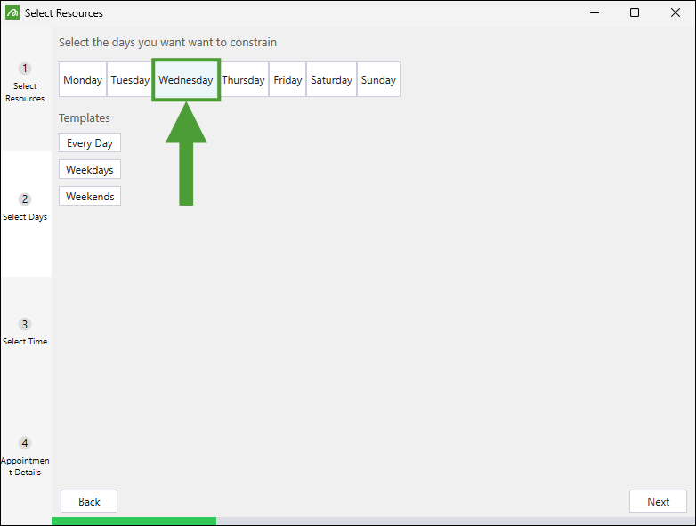 Select the days where you want the appointment to be scheduled, then click Next.