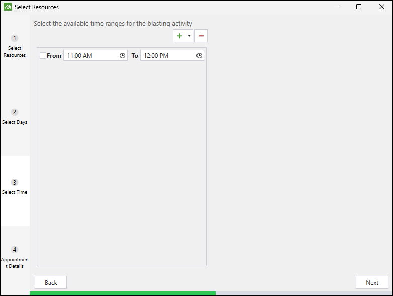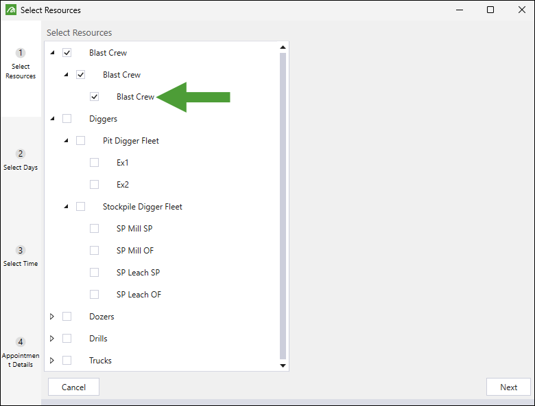 In the Select Resources panel, choose the resources you want to assign to the blasting appointment.