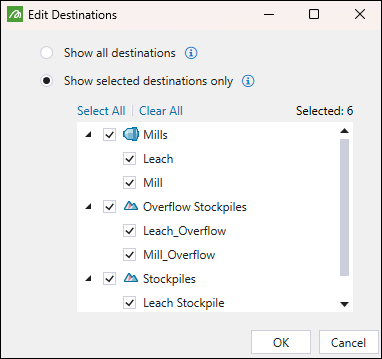 Destination Priority subtab (see Destination Priority for more information). Once a destination reaches its accumulation limit for a given period, it will become unavailable until the next period begins and the material will be sent to the next available destination, based on priority. You can set the Destination Rate constraint for mills, stockpiles, and overflow stockpiles.