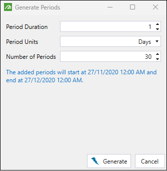Adds multiple periods of the same duration at once. When you click this button, you can configure the following in the Generate Periods panel: As shown in the example below, after specifying 30 periods, each lasting 1 day, Evolution has automatically calculated the end of the reporting cycle based on the entered data and setup settings.