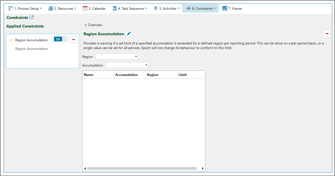 Use the Region Accumulation constraint to place a maximum limit on the material processed from each defined region per reporting period. You can create limits for each reporting period, or constrain all periods with a single limit. If a schedule exceeds the limit you set, it will temporarily pause and display a warning.