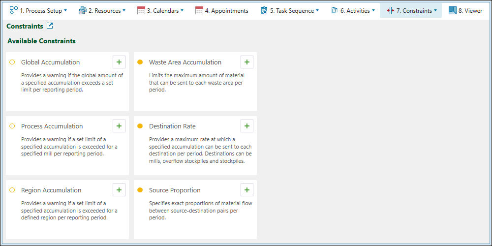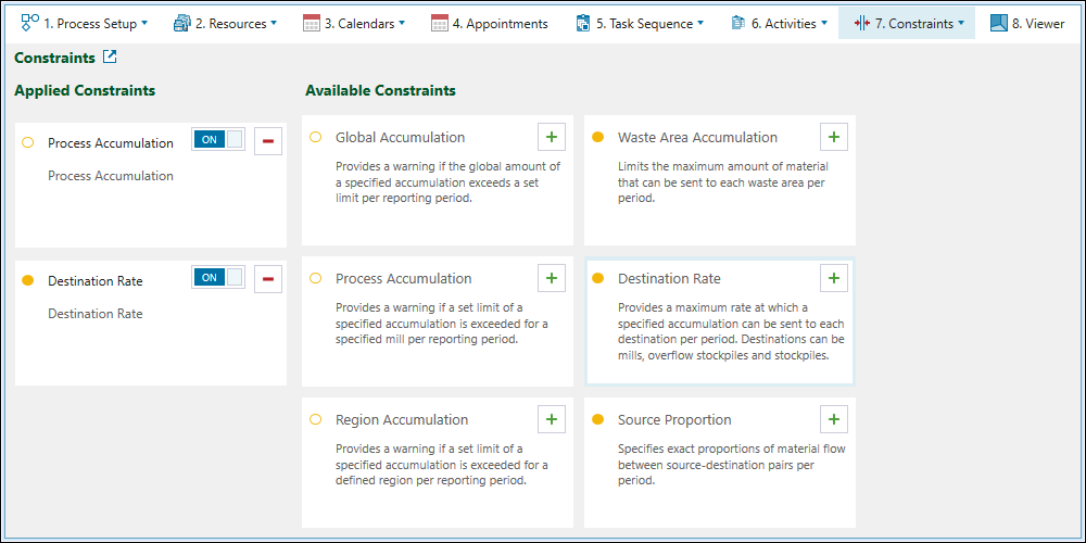| Region Accumulation | Soft | Limits the maximum amount of material that can be extracted from a region per reporting period. |