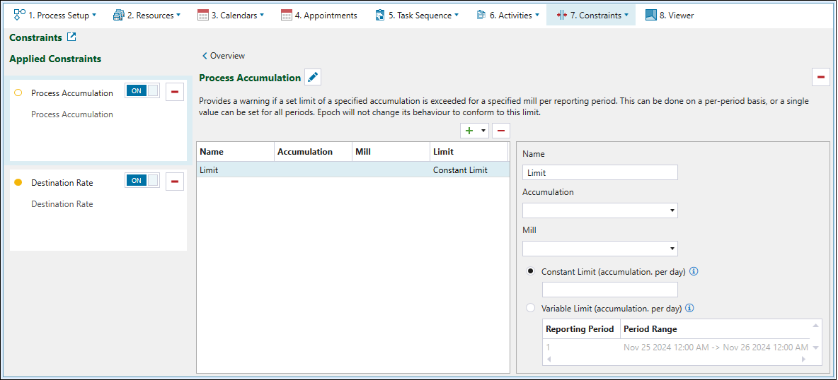 | Process Accumulation | Soft | Limits the maximum amount of material that can be sent to a mill per reporting period. |