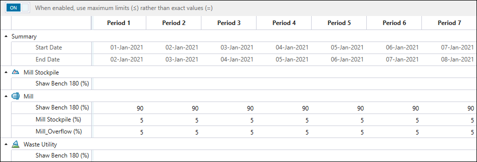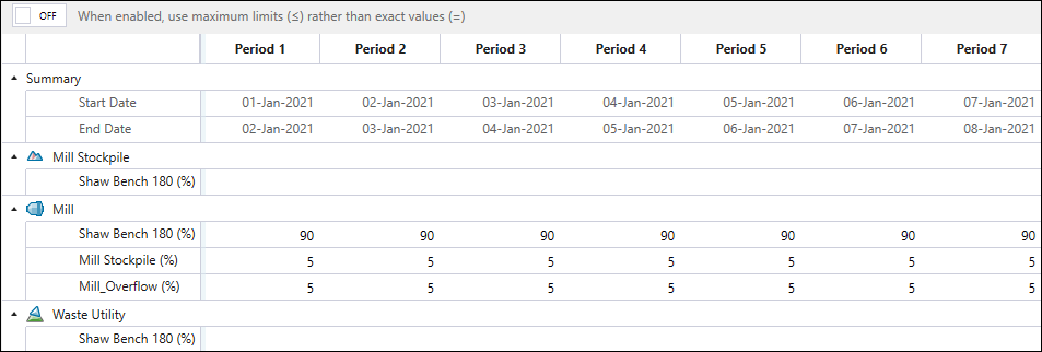 By default, Evolution uses the exact percentages that you have specified. This means that if it cannot meet the exact proportions, no material will be sent to the given destinations. You can change this behaviour to allow for more flexibility by using the maximum limits, rather than the exact values. In that case, the amount of material sent by Evolution to the given destinations will be less than or equal to the specified values. To use the maximum limits, click the toggle button at the top of the constraint calendar.