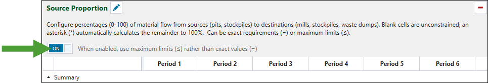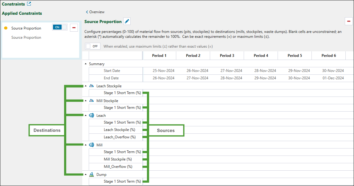 Use the Source Proportion constraint to specify proportions of material sent from sources to destinations in each period. This allows you to achieve a more precise and realistic control of the feed flow to the plant.