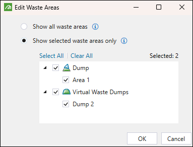 Click the Edit Waste Areas… button to specify the waste areas for which the constraint should be set. After selecting which waste areas should be included in the constraint, click OK to confirm your selection. You can select from the following options: