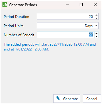 (Generate periods)Adds multiple periods of the same duration at once. When you click this button, you can configure the following in the Generate Periods panel: