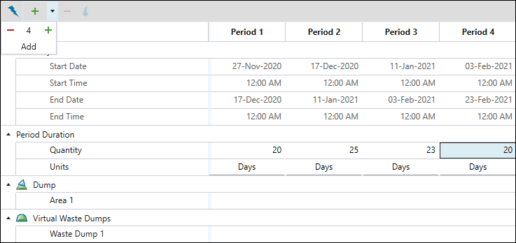 Adds multiple periods to the constraint calendar according to the number that you have entered. You can set a different duration for each added period by specifying the Quantity and Units fields.