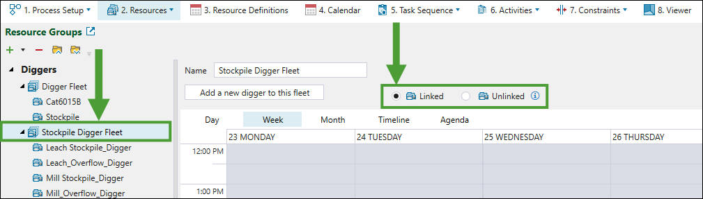 Linked (see Resource Groups for more information on configuring the equipment and process flow components and specifying their schedule in a setup).