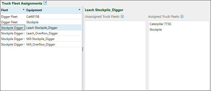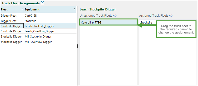 When a truck fleet is assigned to a particular digger, the trucks constituting this fleet are able to transfer material from the digger to the intended destination of the transported material. On the other hand, the truck fleets unassigned to a particular digger will be excluded from transporting material from that digger. To change the assignment of a truck fleet for a given digger fleet, select the required digger fleet and drag the truck fleet to the Unassigned Truck Fleets or Assigned Truck Fleets column, as needed.