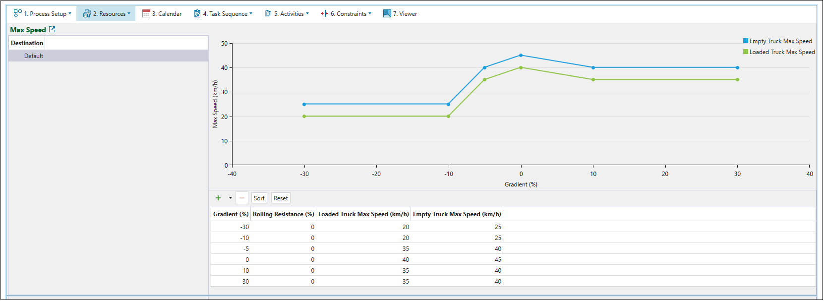 The Max Speed tab is used to plot the unloaded and loaded maximum truck speeds against the road gradient. All points in the graph are editable. Values from the graph will be used to calculate travel time when the setup contains a road network.