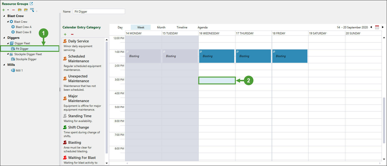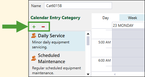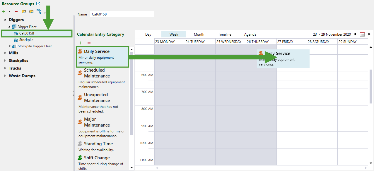 To add an entry to the calendar, click on the fleet item to which you want to assign a calendar entry, select one of the predefined categories in the Calendar Entry Category column, and drag it to the required time slot.