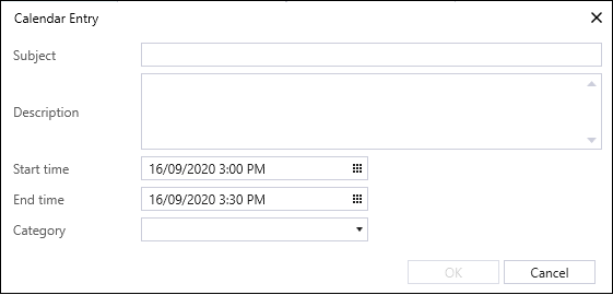 Provide a Subject, Description, Start time, End time, and Category for the calendar event.