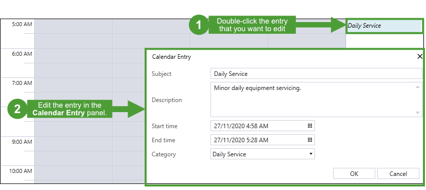 Double-click on the entry in the workspace. This will bring up the Calendar Entry panel where you can apply the required changes.