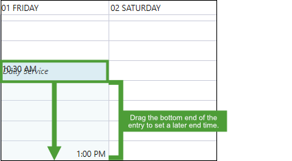 To extend the length of a calendar entry, drag either end of the entry (top end to set an earlier start time or bottom end to set a later end time).