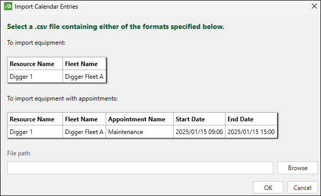 Import Calendar Entries Allows you to import equipment, or equipment with appointments from a CSV file. When you click this button, the Import Calendar Entries panel containing examples of the required file formatting will appear.