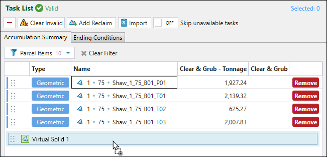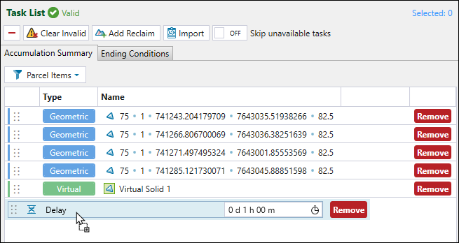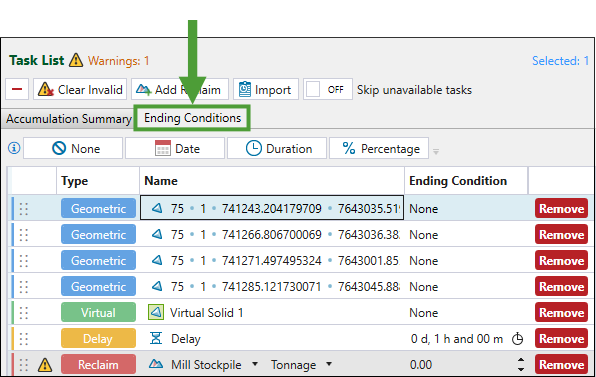 After adding tasks to a task list, you can control the ending of each task by using ending conditions. Ending conditions allow you to specify if the equipment working on the task list should end a task early based on a given condition. You can also directly schedule stockpile reclaims by adding specific reclaim tasks to the task list.