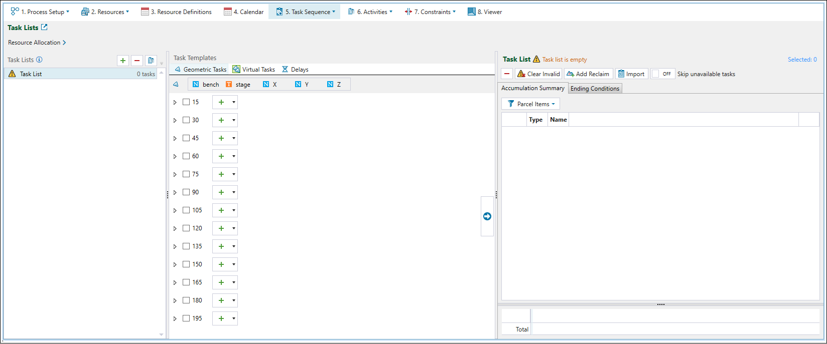 Task Lists subtab to define a sequence of tasks that form a task list. More specifically, you can schedule geometric tasks, virtual tasks, delays, and stockpile reclaims in task lists. You can then assign task lists to equipment in the Resource Allocation tab. Epoch also allows you to import task lists in a CSV file.